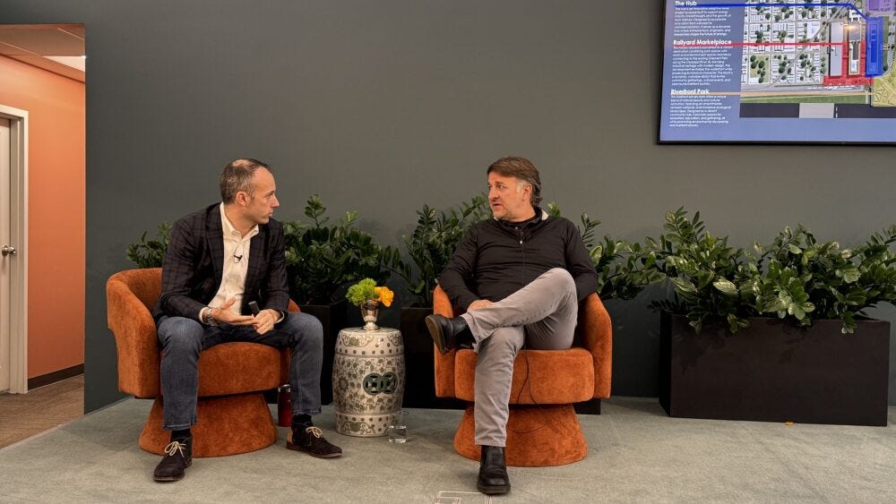 The model Gibbs keeps returning to is Industry City in New York — a campus where the draw is the aggregation of things to do, not any single anchor. He is also in conversations about a grocery store and has had an inquiry from Waymo. The lease from the city runs for 99 years at $150,000 a year for the entire campus.