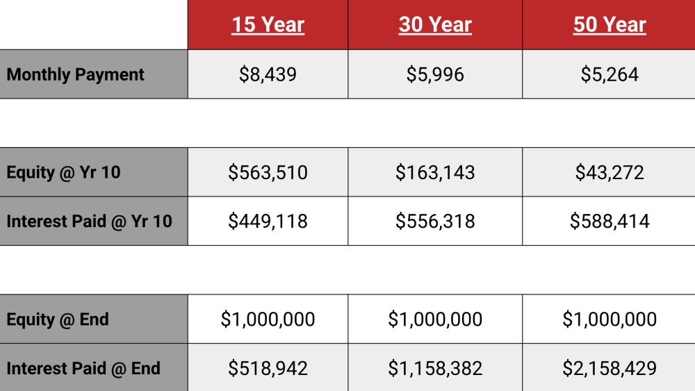 That’s less than a $300 monthly difference between the 30-year and 50-year loans. But here’s the catch — that small “savings” comes with a massive long-term cost.