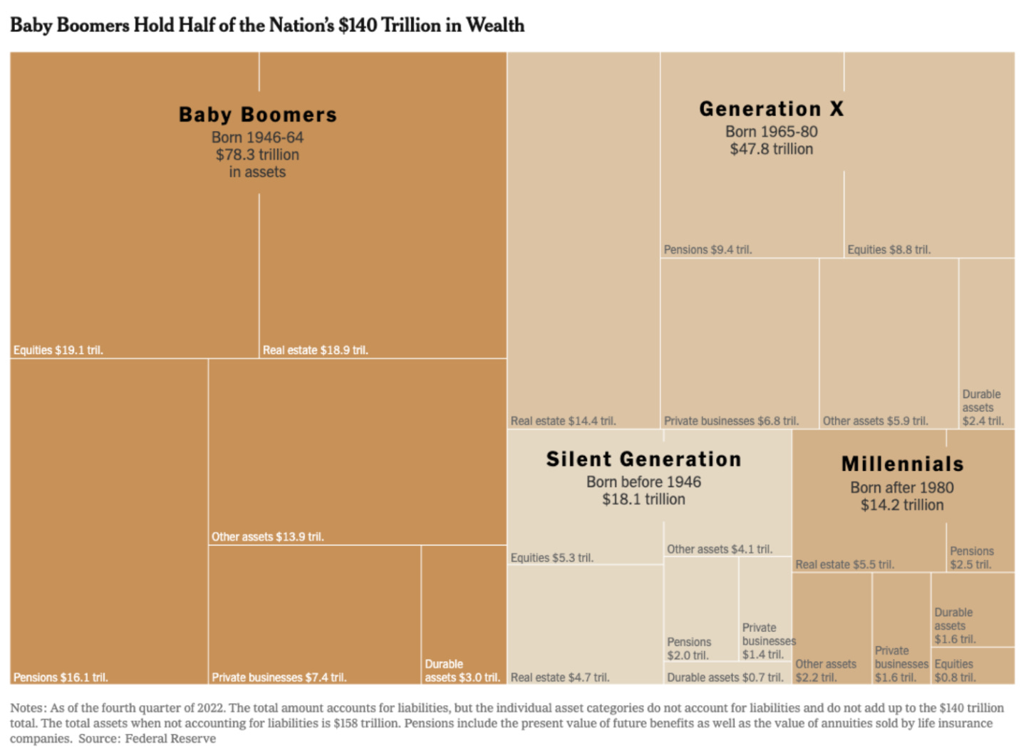 But behind all the noise, something serious is happening: the largest transfer of wealth in human history. According to The New York Times, Baby Boomers currently hold about half of the nation’s $140 trillion in wealth, and much of that is in real estate — around $18.9 trillion worth. That wealth is starting to shift to younger generations.